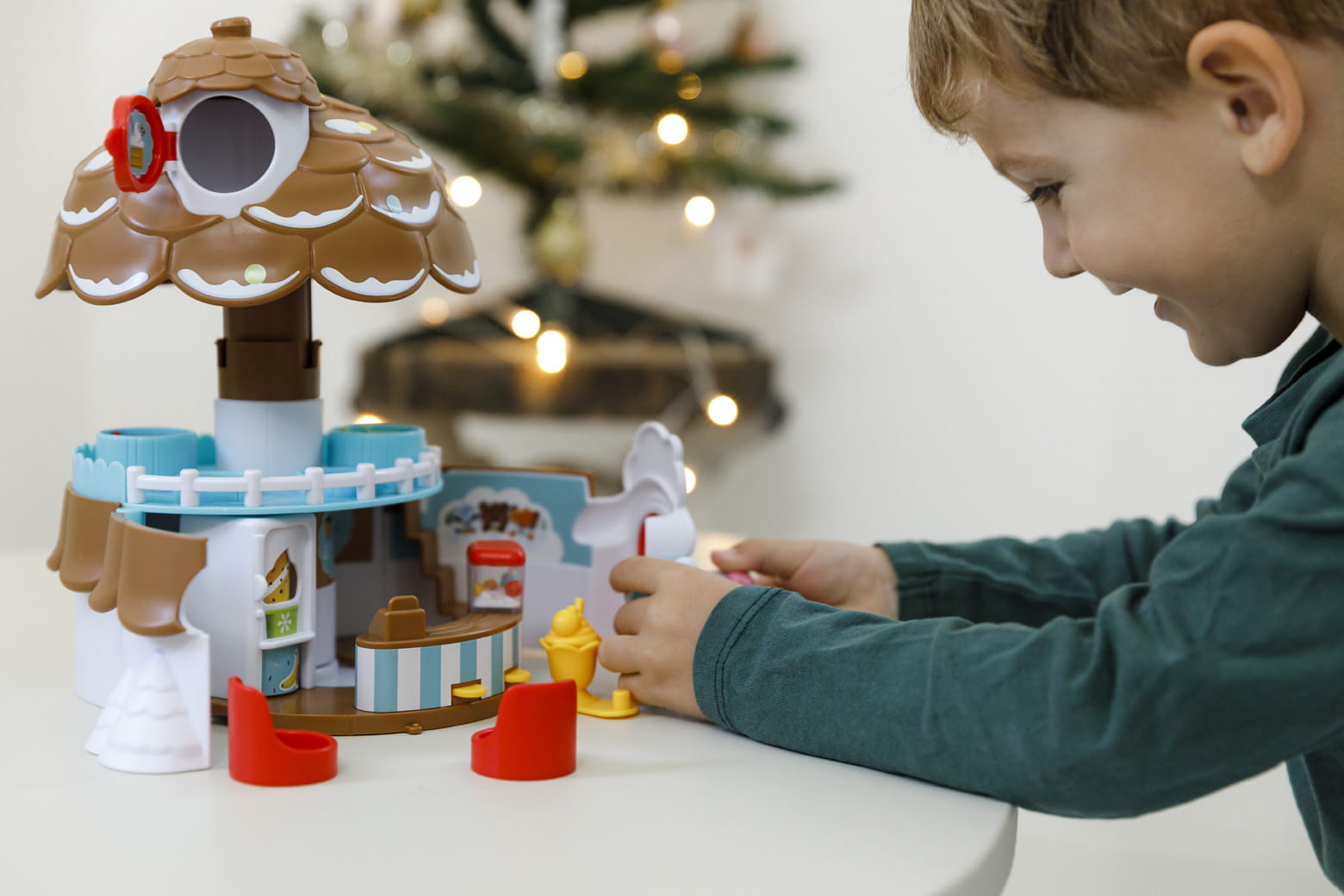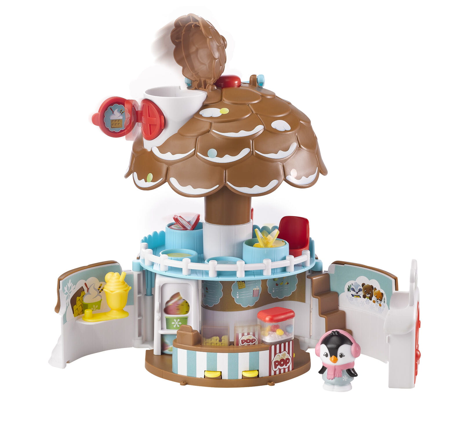 Naciśnij przycisk na szczycie dachu, aby lodziarnia się otworzyła. Domek ma dwa piętra i okno na dachu, w którym można postawić zwierzątko. Na piętrze lodziarni są dwa stoliki i fotele dla gości. Stoliki mają obrotowy blat, na których są różne rzeczy. Na parterze lodziarni jest blat z kasą i maszyną do popcornu. Po naciśnięciu guziczka popcorn będzie skakać w maszynie. Z blatu wyskakują gorf z czekoladą i opakowanie z popcornem po naciśnięciu przycisków. Obróć wałeczek aby wybrać smak lodów. A potem podaj lody gościom.
