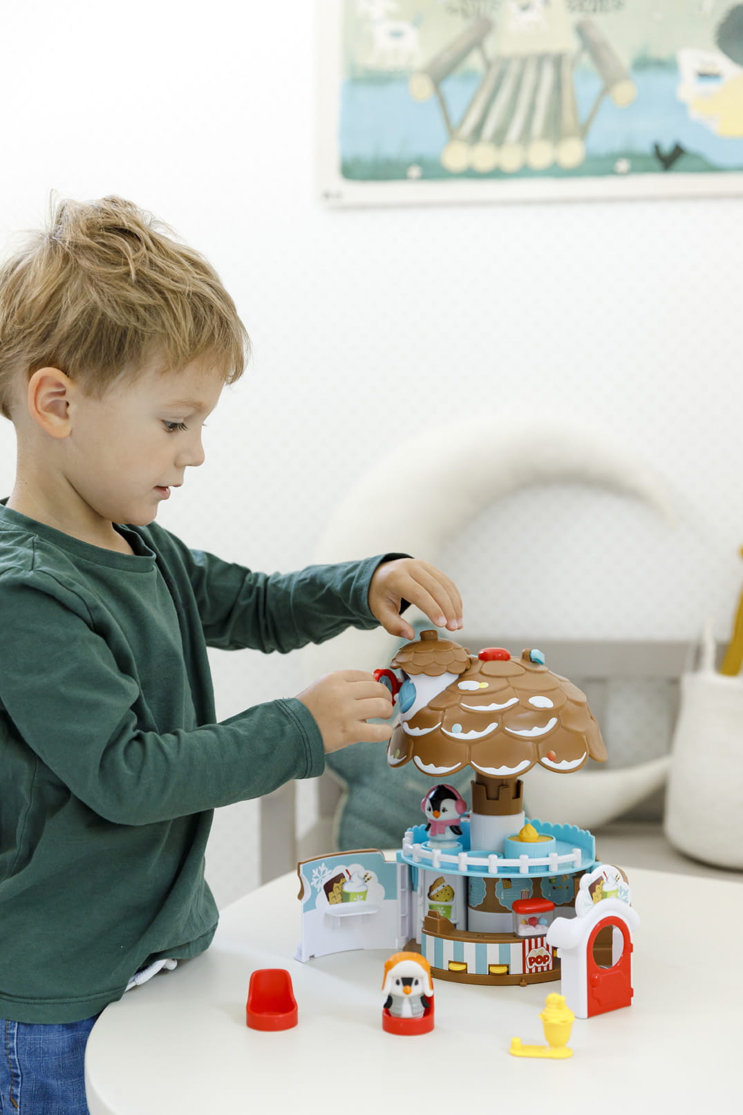 Zestaw Lodziarnia Szyszka zawiera: rozkładaną lodziarnię, zwierzątko (pingwin), lody, dwa fotele. Zabawka dla dzieci w wieku 18 miesięcy +.