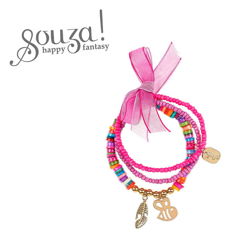 Bransoletka 3w1 Sula holenderskiej marki Souza! składa się z dwóch bransoletek (15 cm) z drobnych zaokrąglonych koralików (różowych z blaszką z logo marki i fioletowych) oraz jednej - z większych płaskich koralików we wszystkich kolorach tęczy i kilku złotych perełek, ozdobionej dwiema metalowymi zawieszkami pszczółki i listka. Bransoletki związane są podwójną tiulową kokardką (różowo-fioletowa). Koraliki nawleczone są na elastyczną silikonową gumkę, dzięki czemu są wygodne do nakładania. Biżuteria jest lekka, delikatna, nietoksyczna i nie podrażnia skóry. Idealna zarówno na przyjęcia, jak i na co dzień. Sprawdzi się także jako stylowy prezent.